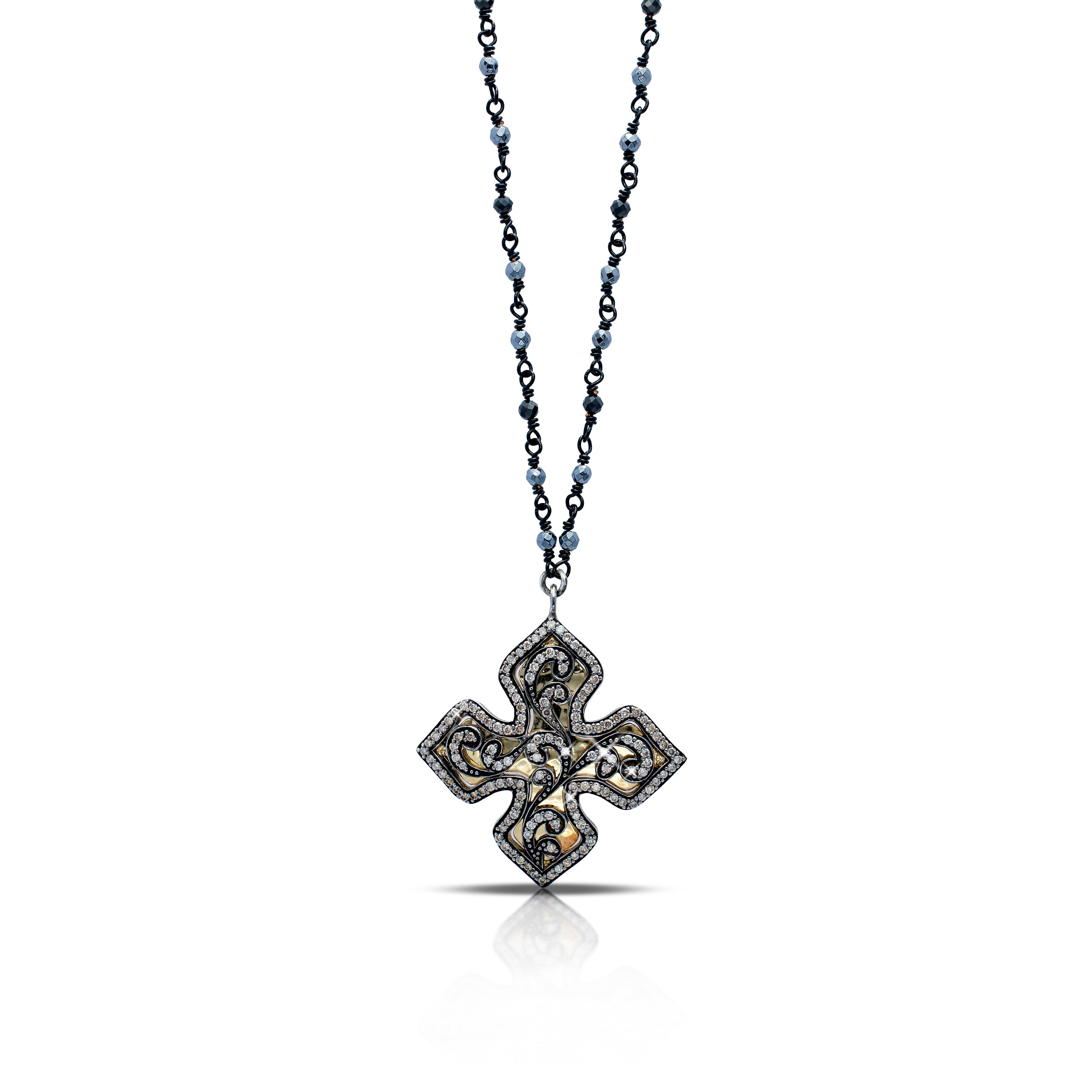 This 18K Gold Brown Diamond Scroll Stylist Cross Pendant with Wire-Wrapped Spinel & Hematite Chain (17-20")