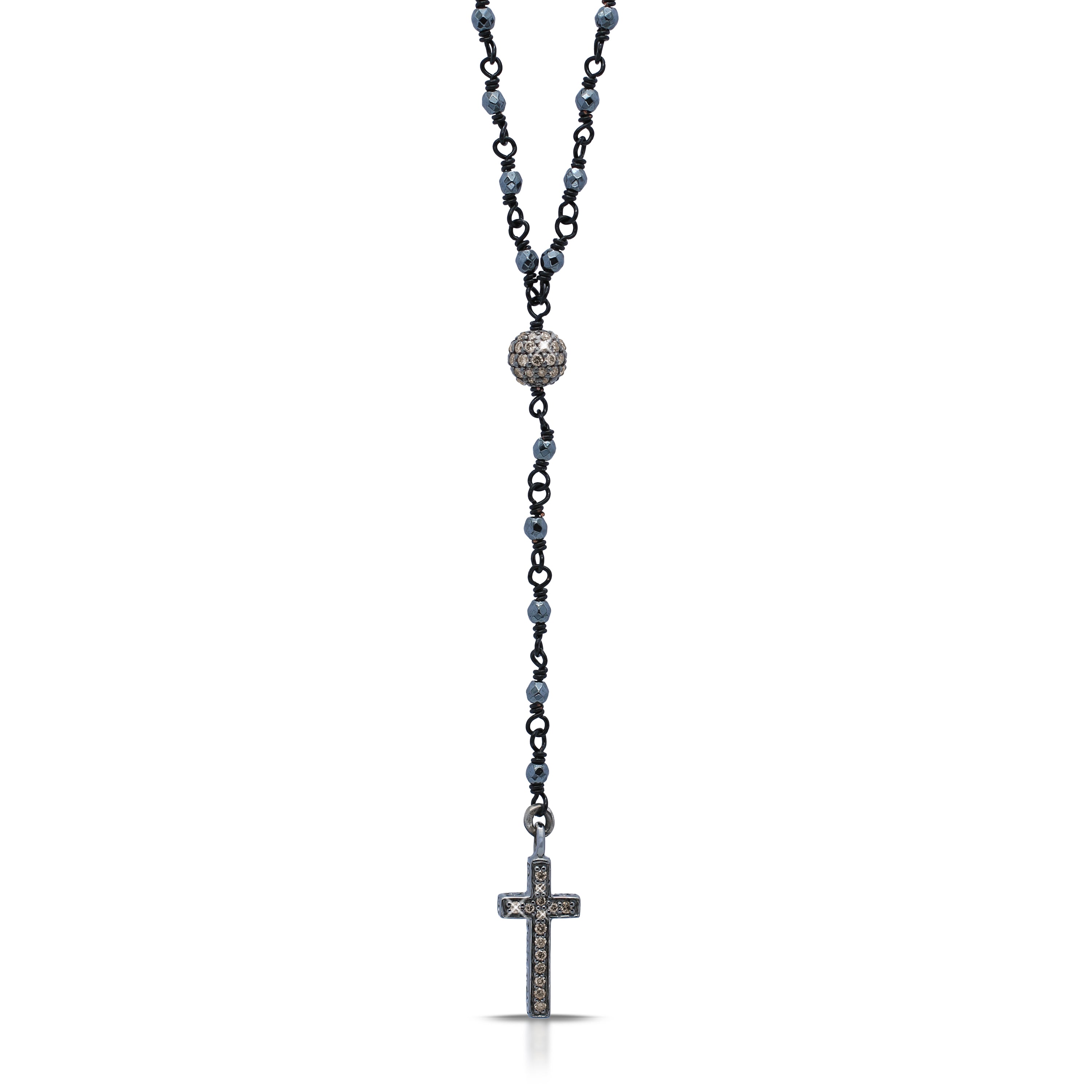 This Brown Diamond Cross Pendant with Wire-Wrapped Hematite Lariat Necklace (17-20")