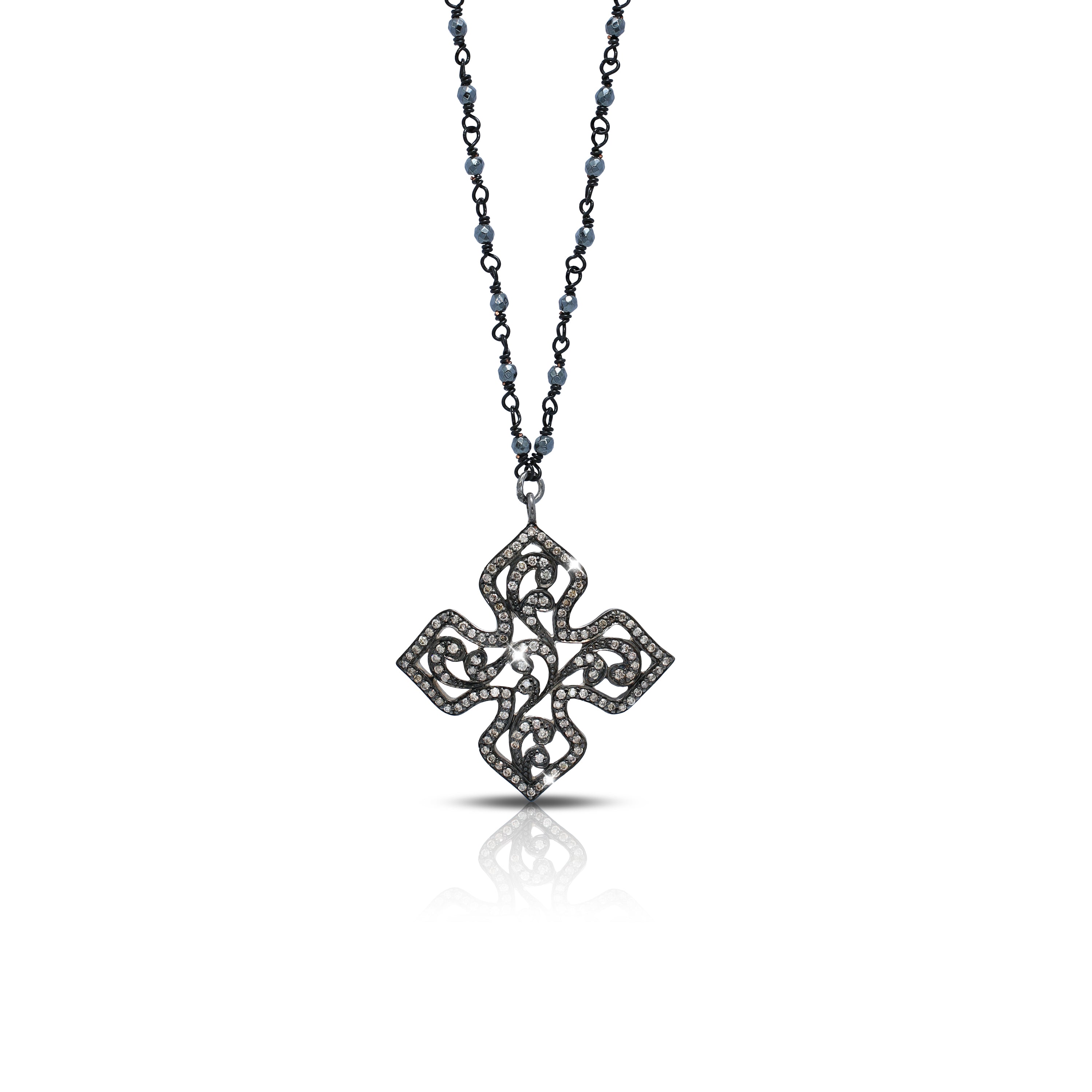 This Brown Diamond Open Scroll Four Arrow Pendant with Wire-Wrapped Hematite Chain (17-20")