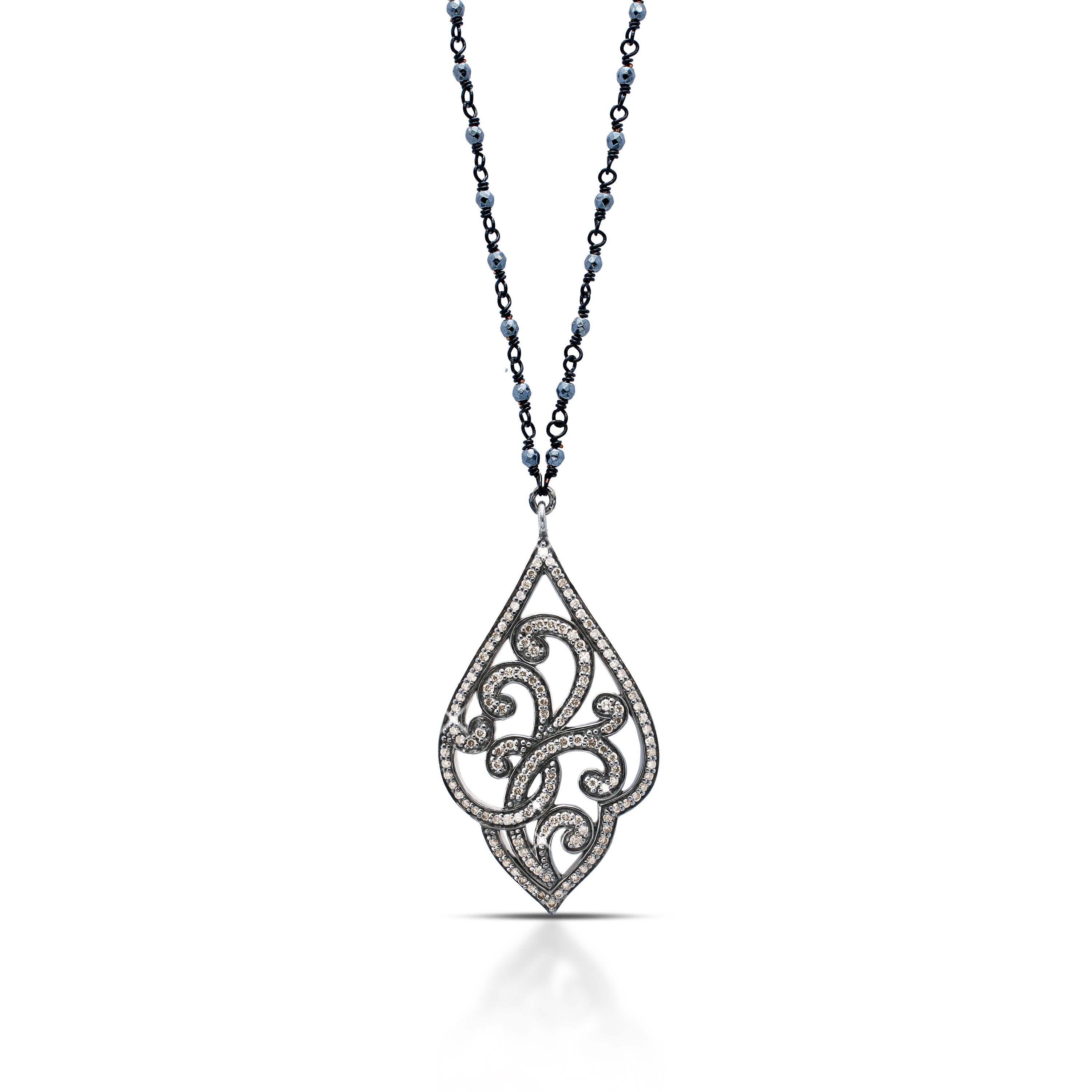 This Brown Diamond Open Scroll Style Marquise Pendant with Wire-Wrapped Hematite Chain (17-20'')
