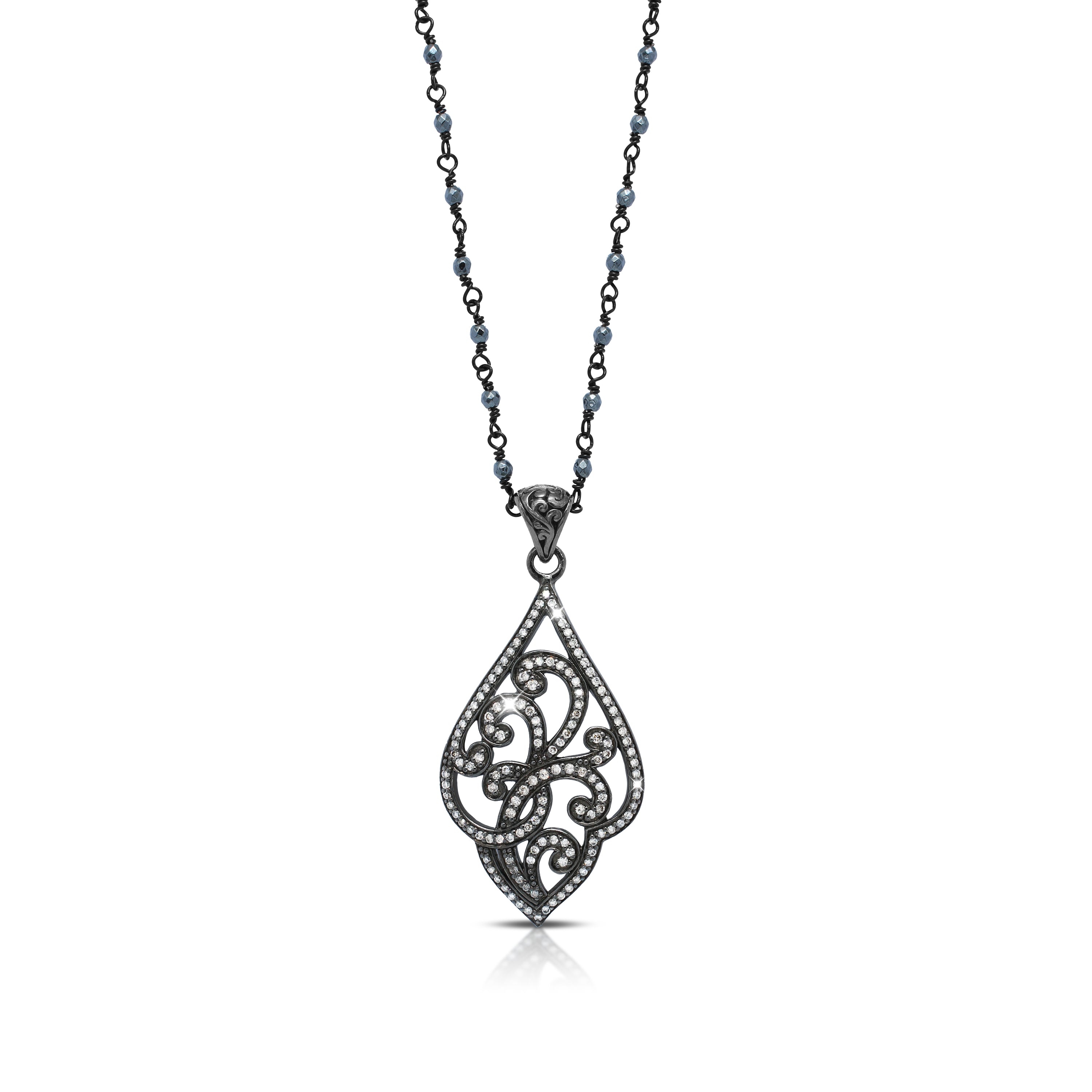 This Brown Diamond Open Scroll Style Marquise Pendant with Wire-Wrapped Hematite Chain (17-20'')