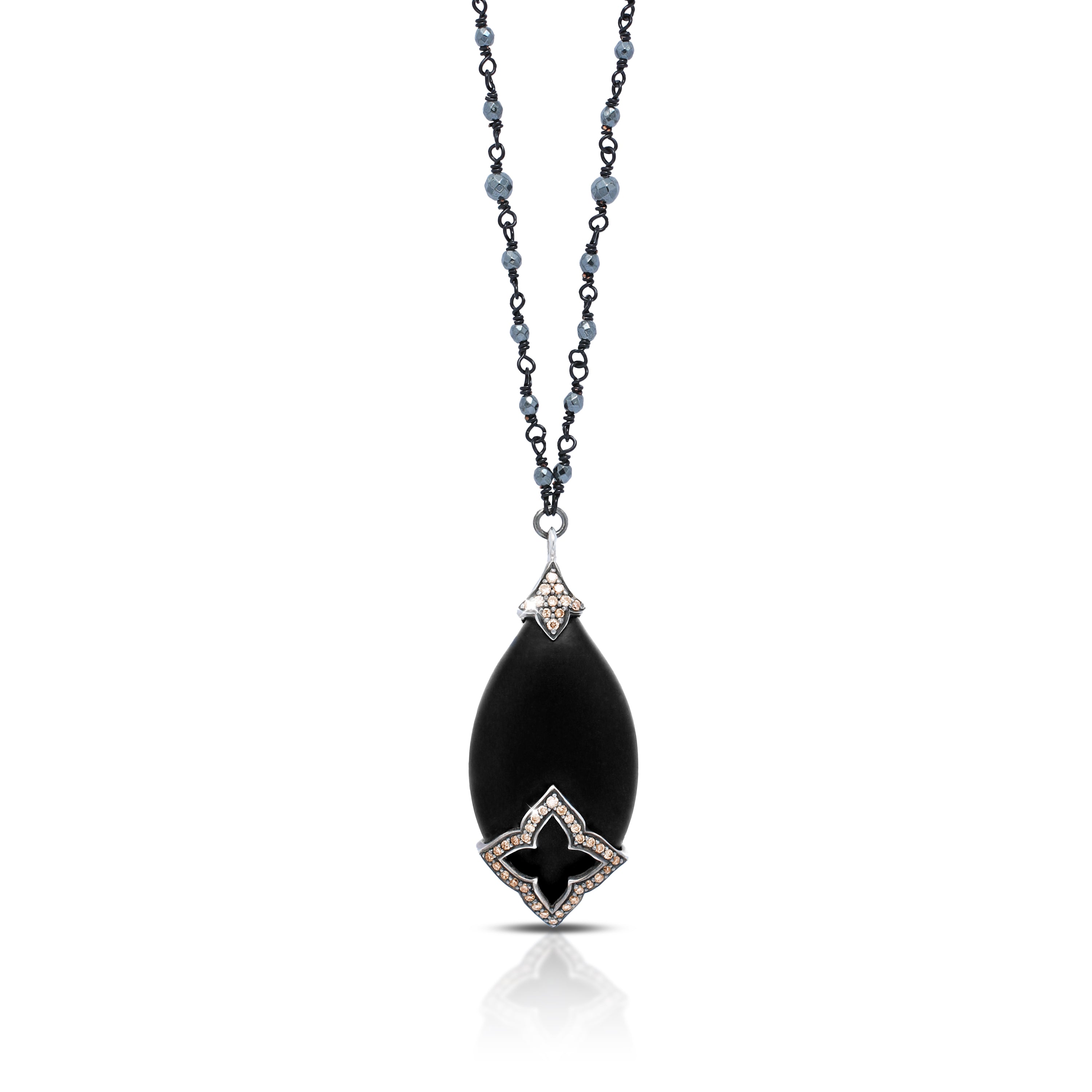 This Matte Black Onyx Long Teardrop and Brown Diamond with Wire-Wrapped Hematite Chain (17-20")