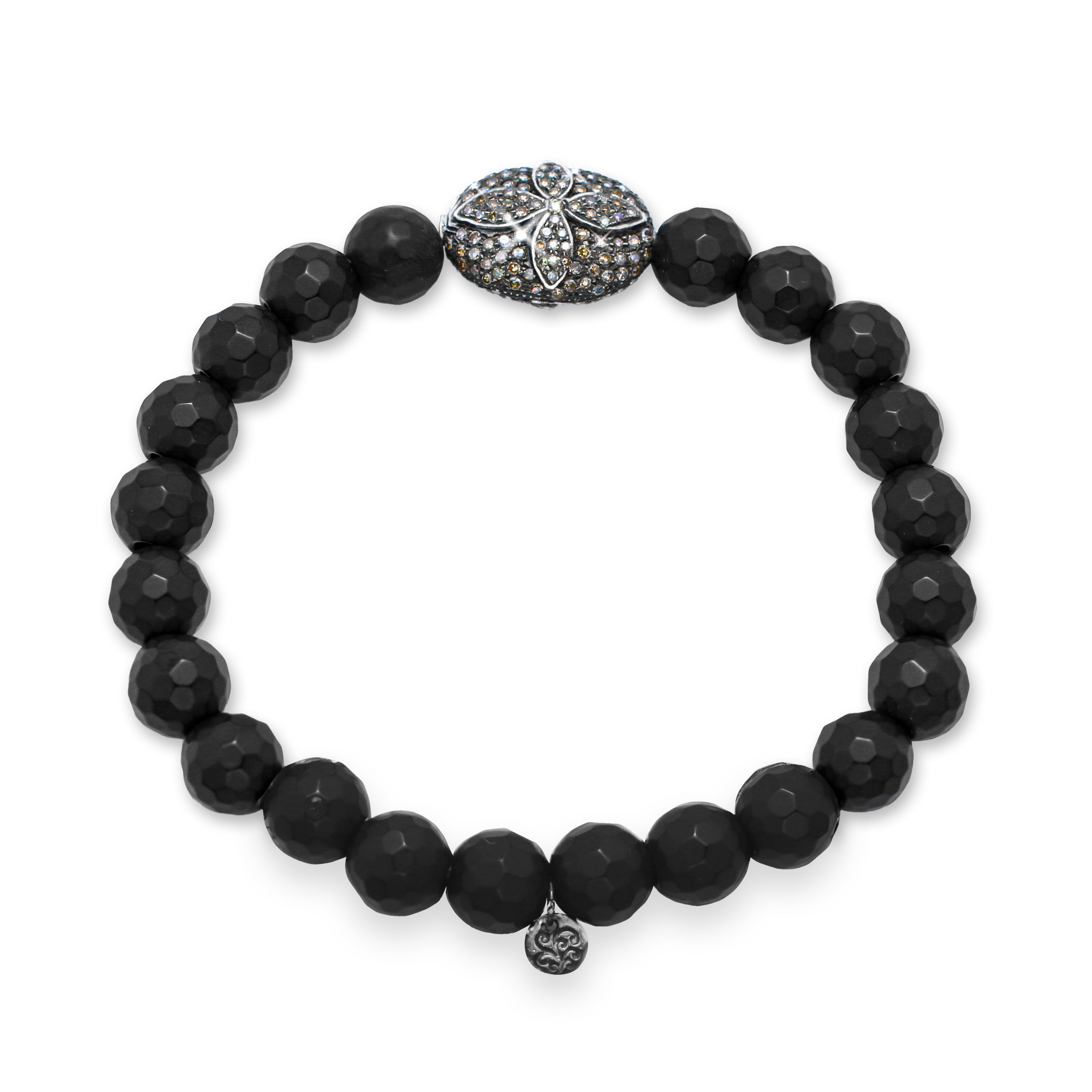 This Oval Paved Brown Diamond Cross with Matte Black Onyx Stretch Bracelet (8mm Diameter)