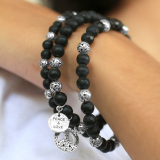 "Peace & Love" Charm with LH Scroll Peace Sign Matte Black Onyx 6mm Stretch Bracelet